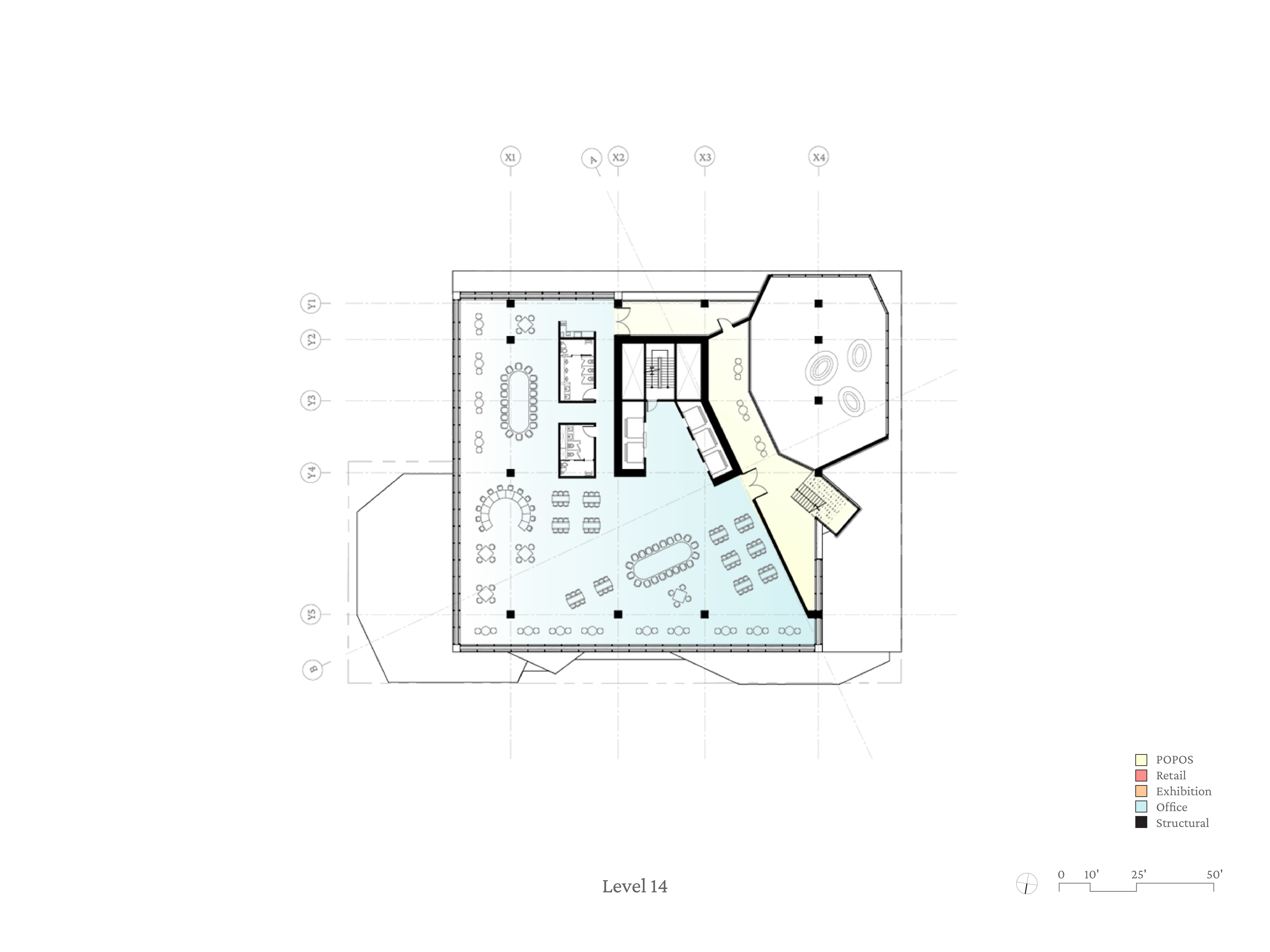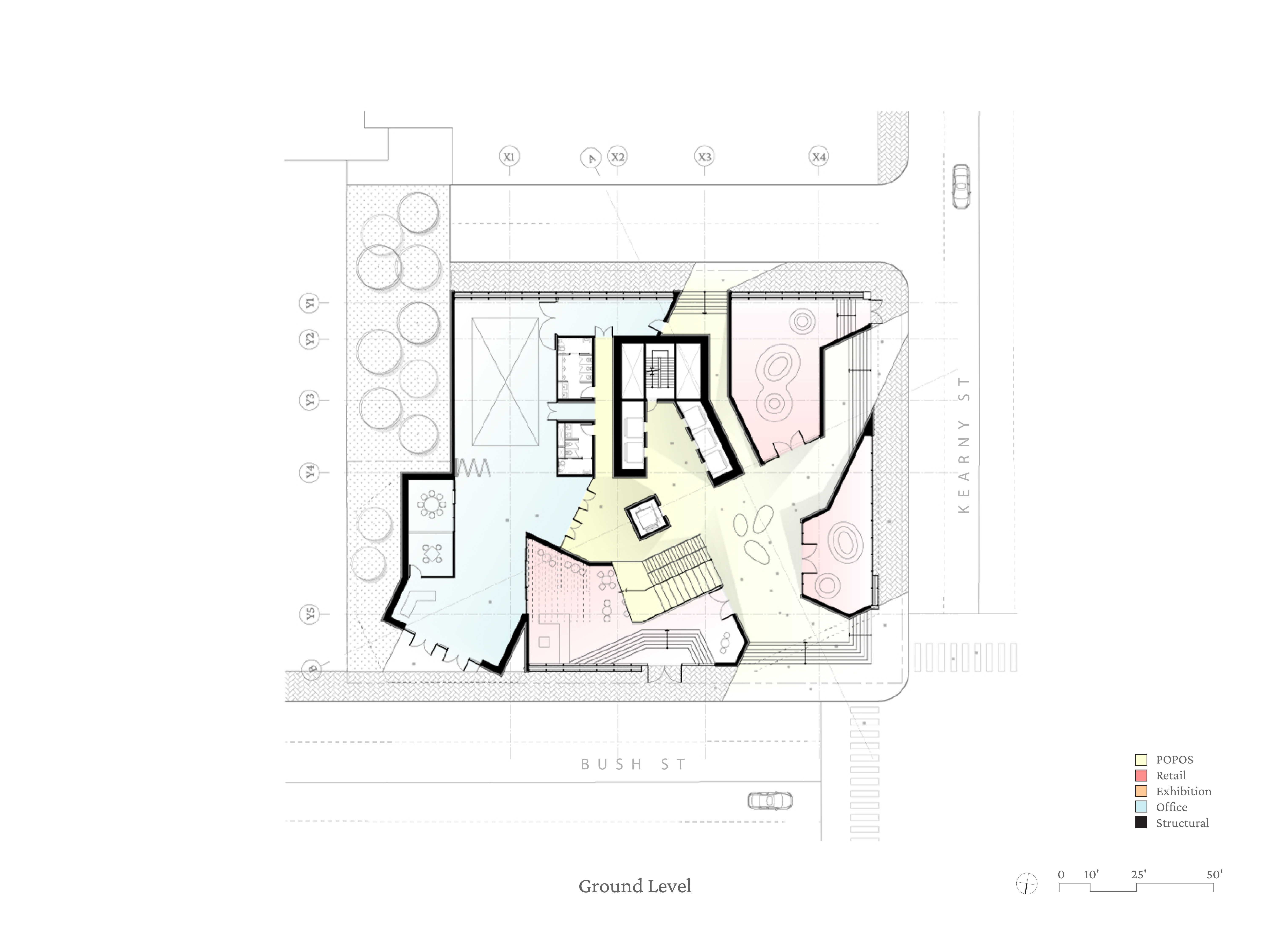Following a set of gridlines generated from three main streets of SF, the ground floor is carved to create pedestrian-friendly entries and voids, inviting the surrounding public activities to manifest. This grid system applies to architectural elements and structural systems including the core, columns, and space trusses. The project strives to reimagine private office buildings at the forefront of creating a more visible, transparent, and inclusive urban architecture in dialogue with the public.